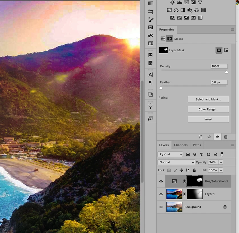 First, with your image open, dupliate the layer. Press Command-Shift-A to take the image into Camera RAW and slide the Dehaze filter all the way over to the right. You can also add a little black to increase the darks if you want, and play with someof the other sliders until you feel comfortable that you have matched the saturation of the other parts of the moruntain. Hit ok and leave Camera Raw
