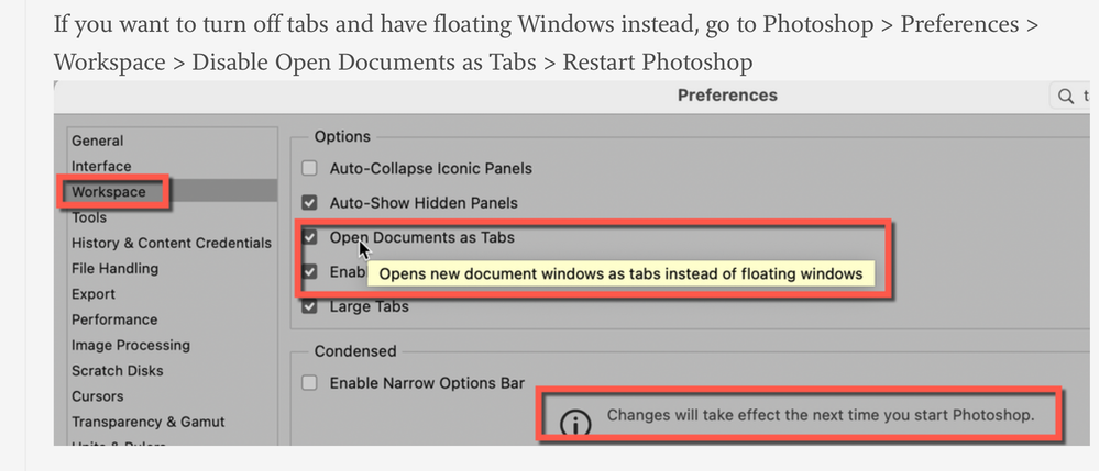 If you want to turn off tabs and have floating Windows instead, go to Photoshop > Preferences > Workspace > Disable Open Documents as Tabs > Restart Photoshop