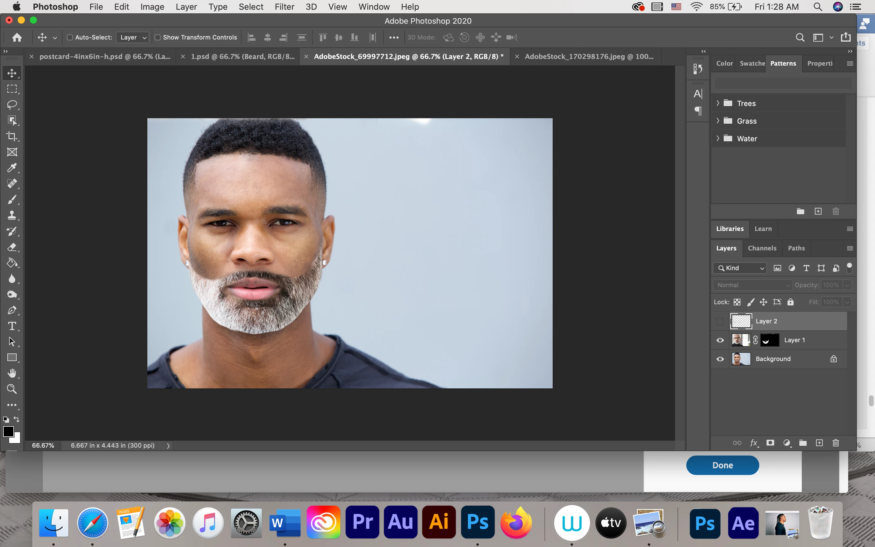 I took the first man's beard and placed it on the second man. Can someone guide me to make it look more realistic? This is my first time doing this. I usually use a hair brush and sketch the whole beard in. Thanks in advance.