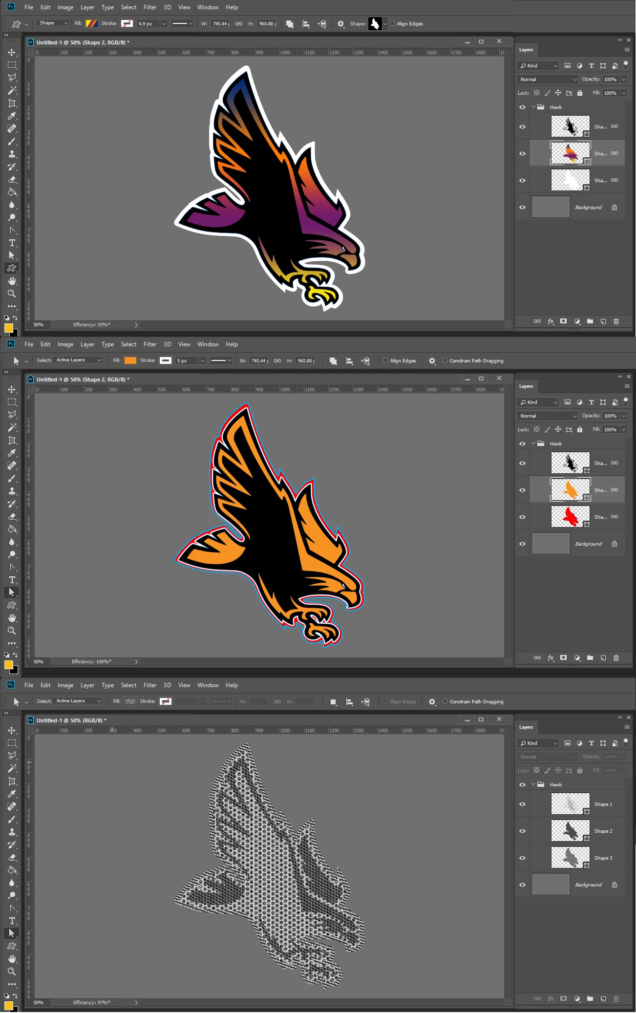 If you are gong to put this onto pictures or fliers in different Photoshop document sizes and resolution. You would want to have it in vector graphic. If you only use Photoshop you want three colors so the would require the stacked shape layers. I created a PSD file you can use to see how it works. Yog can always edit the three shapes toe improve their quality. You can download the PSD file HawkLogo.psdYou
