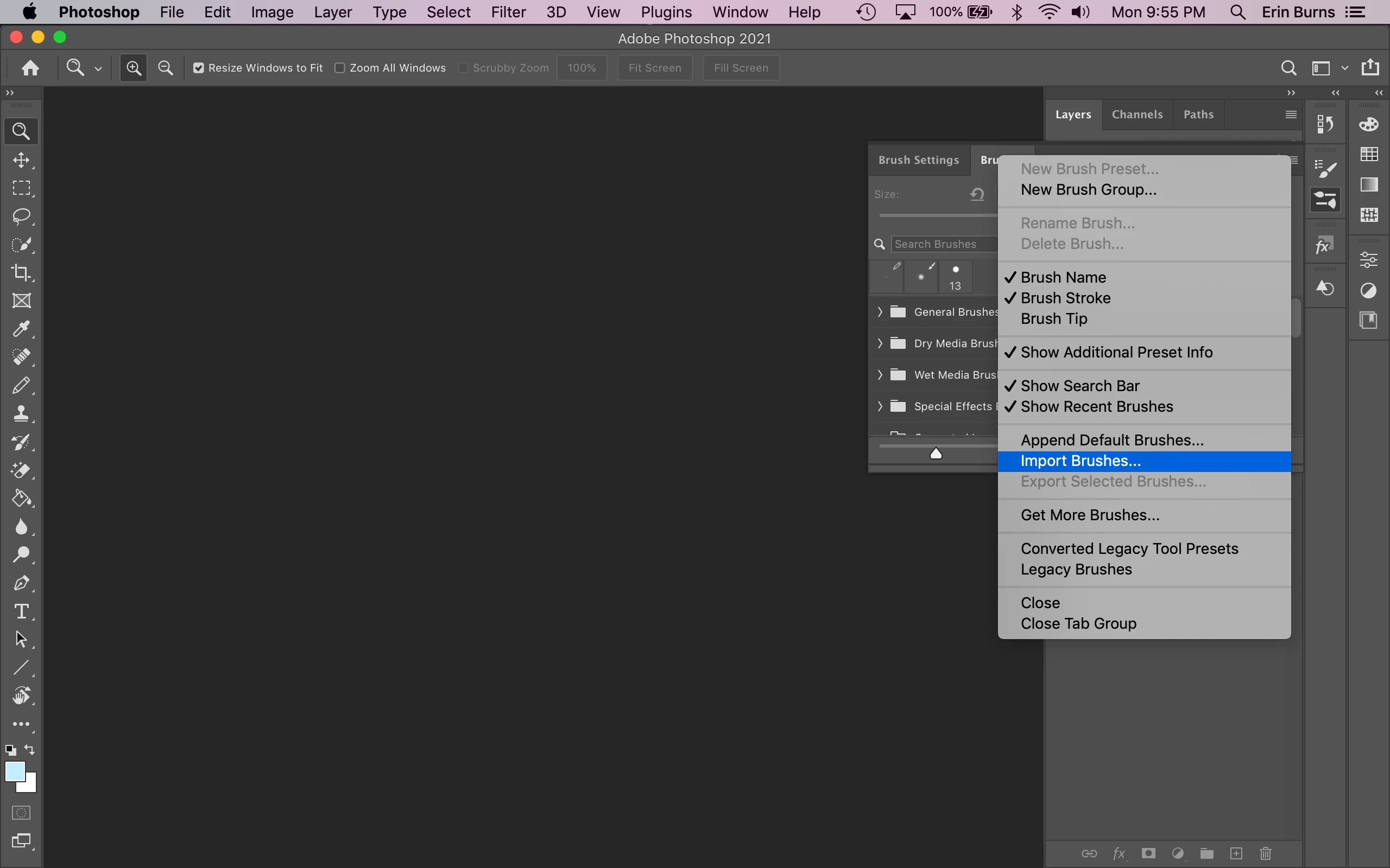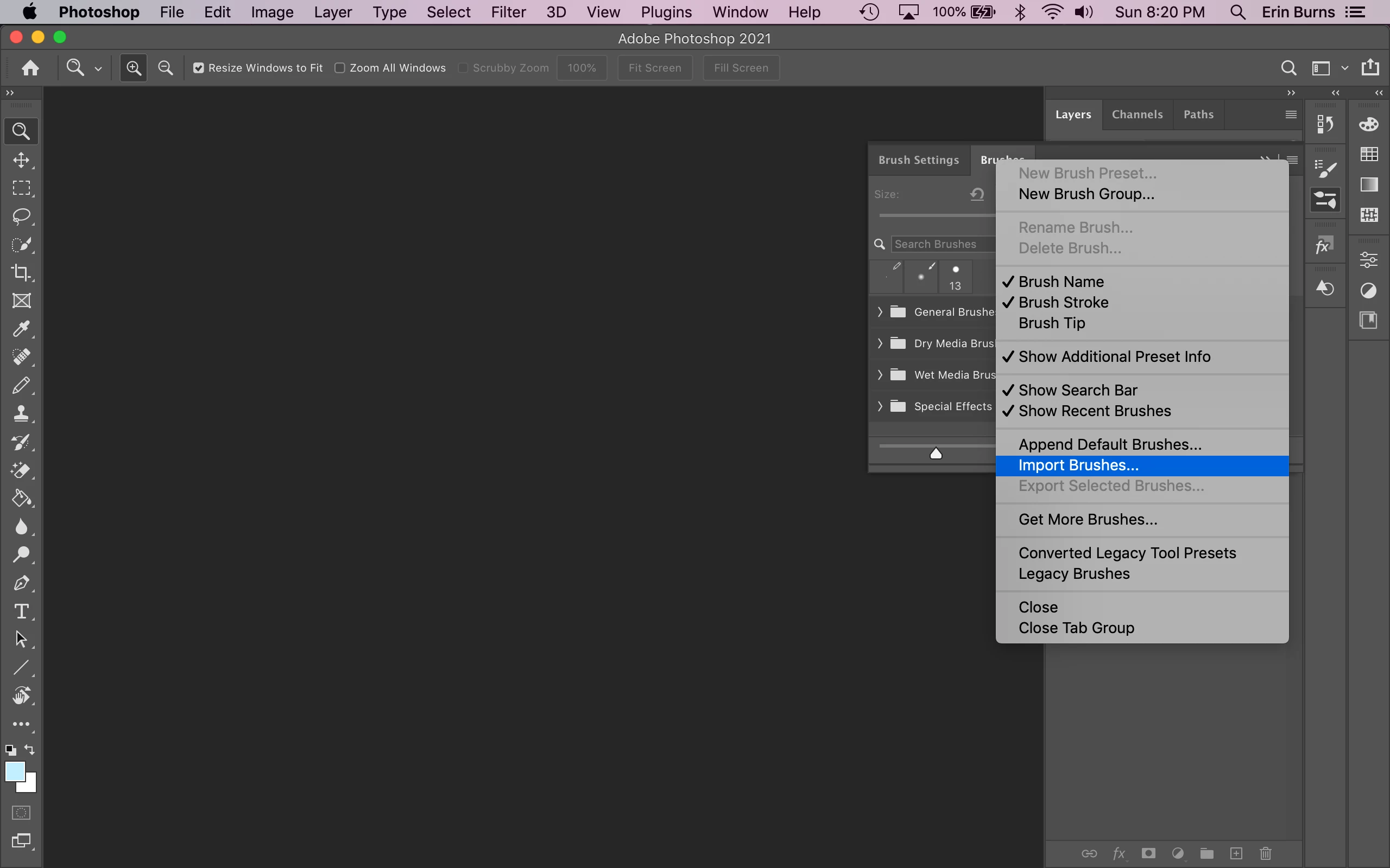 I just bought a subscription to Photoshop, and I tried to save the brushes, patterns, styles, etc. that I have collected throughout the years (when I was using Photoshop Elements) into the Photoshop 2021 Preset folders (ie. User/Applications/Photoshop 2021/Presets/Brushes), but when I opened Photoshop 2021, they weren't there. Then, I imported everything by opening the tabs for the Patterns, Brushes, Styles, etc (see screen shot), and those worked.