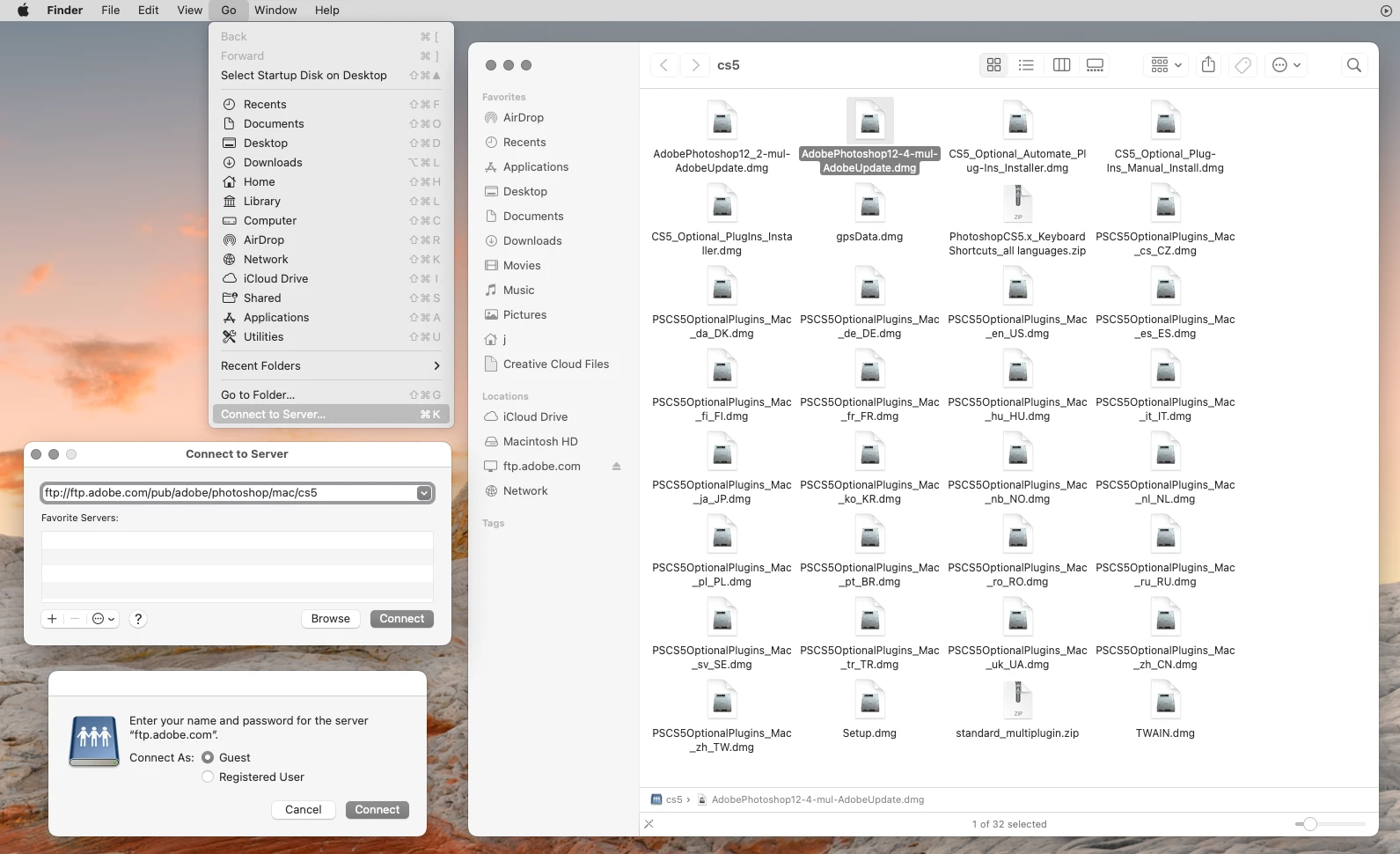 Hello! I'm trying to solve a printing issue where Photoshop crashes every time I try to print. I currently have Photoshop CS5 Extended version 12.0 x64 and I'm running MacOS High Sierra 10.13.6 on a Macbook Pro. I saw a post here that updating to version 12.0.4 might resolve the issue, but the link on that page was dead. I also found another post with an updated link in the comments, but that one didn't work either (it brought me to an FTP that gave an error message: There was a problem connecting to the server "ftp.adobe.com". The share does not exist on the server. Please check the share name, and then try again.)