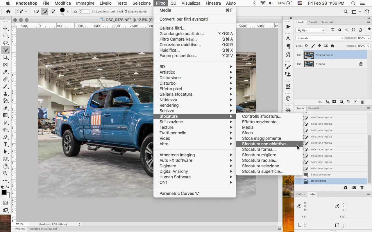 It's there under Filtro>Sfocatura>Sfocstura con obiettivo