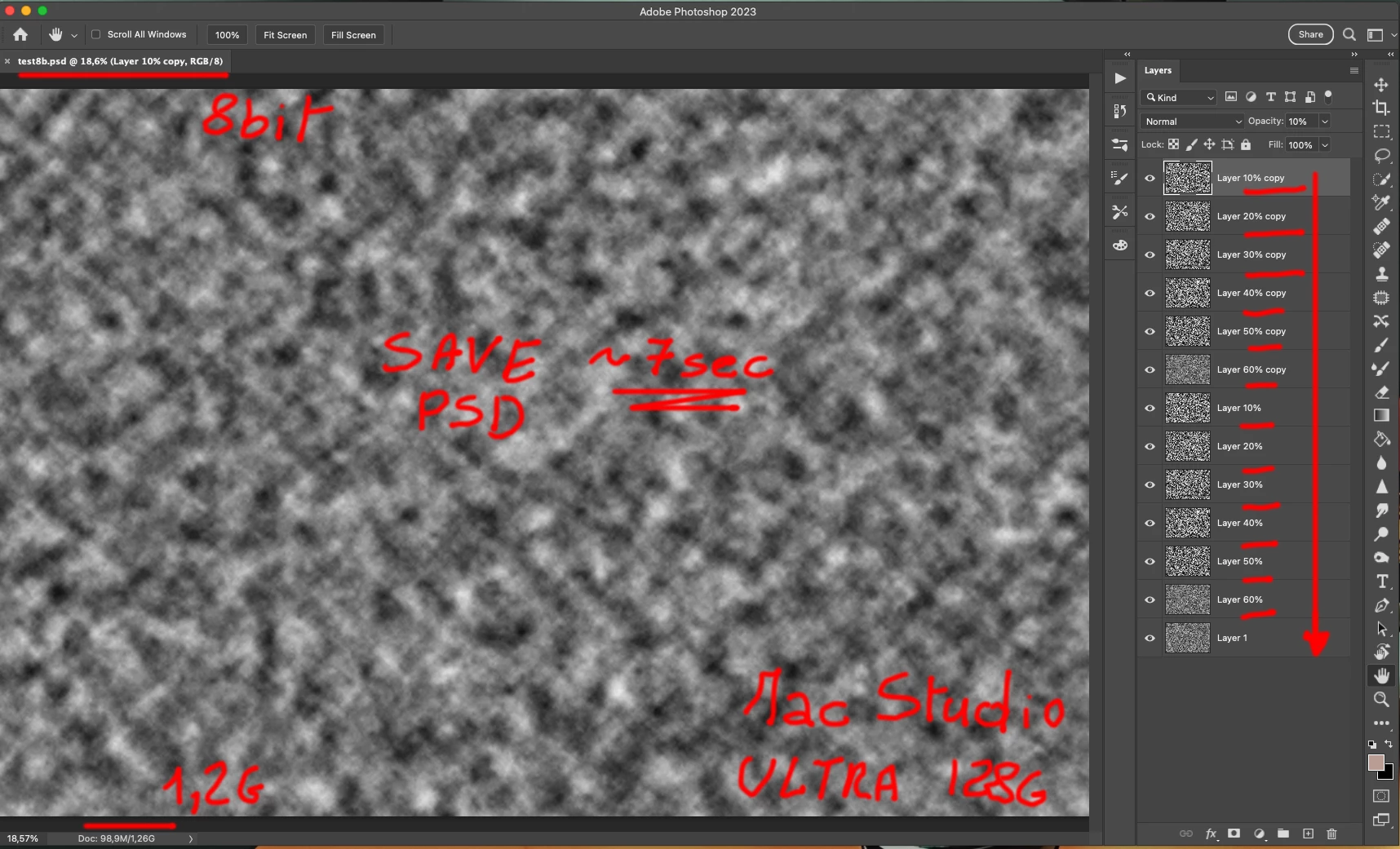 - 8 Bit PSD (Doc size 1.2GB): takes less of 7s
