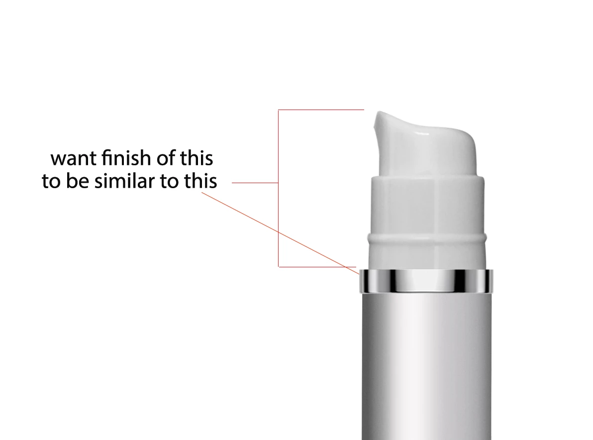I'd like to edit the attached image by changing the finish of the white plastic neck and pump on the top of this cosmetic bottle to match the shiny silver piece below it, but still maintain the shape and contour of the white plastic neck and pump.