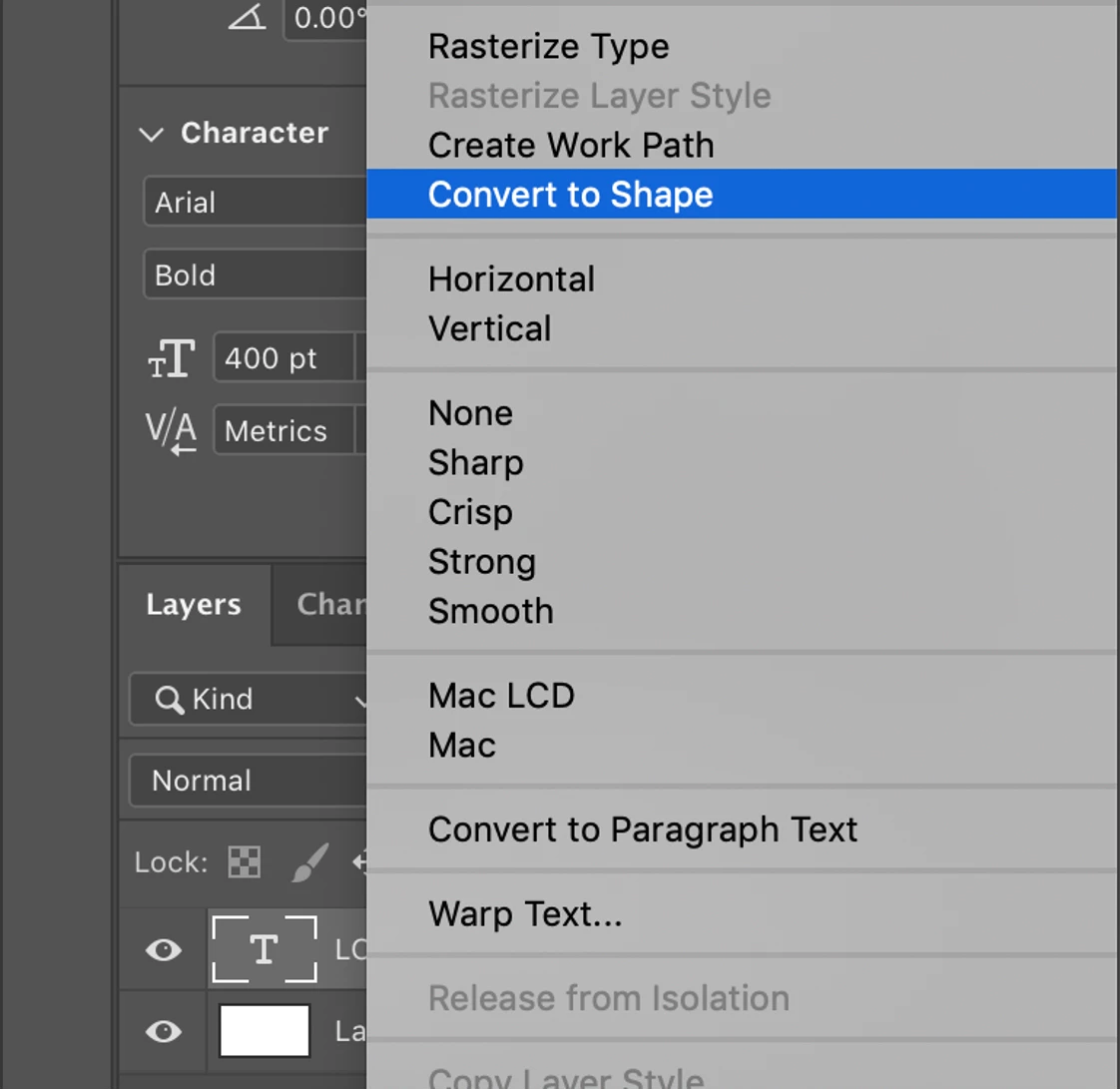 - From the drop-down menu select the option, Convert to Shape. The text tool in Photoshop is relatively limited. So in order to transform your type freely you'll need to convert it into a shape.