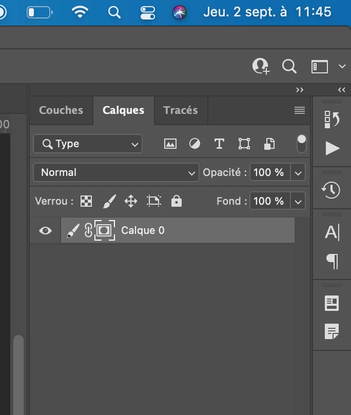 Bonjour, les vignettes sont désactivées, faites un clic droit sur le pinceau qui remplace la vignette de calque et sélectionnez "petites vignettes" (je crois que c'est la bonne traduction).
