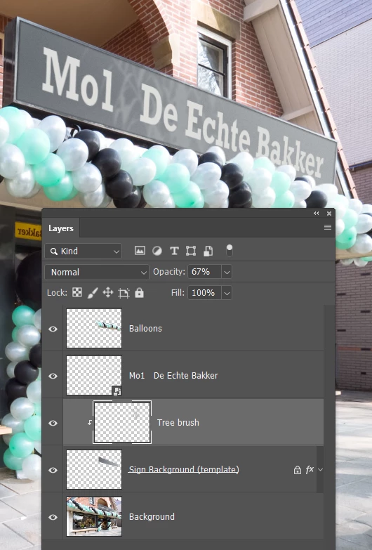 I finished off by matching the background better, and stamping a tree brush on a layer clipped to the sign layer