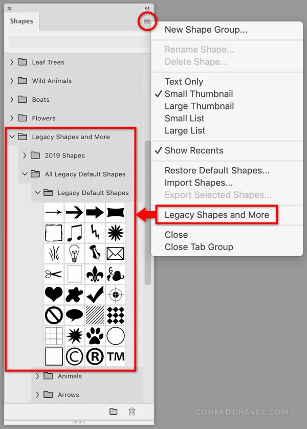 On my Mac, how do I restore my legacy shapes in Photoshop 2020? I'm missing the basics shapes such as arrows, bubbles, etc