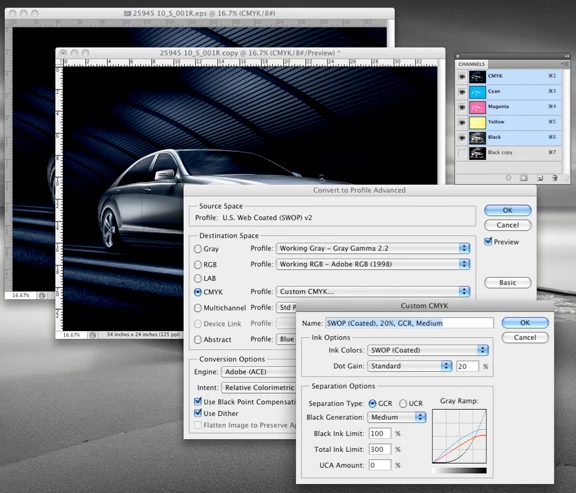 3. Now on the "copy" image, you want to choose Edit > Convert to Profile. Here you will choose Custom CMYK and in the next dialog box change the Total Ink Limit to the desired amount, in this case 300.