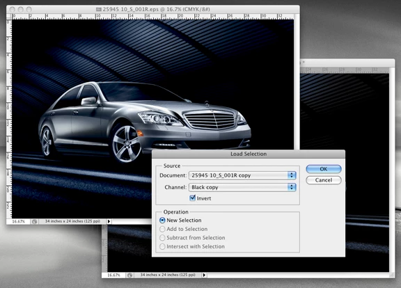 6. Go to your other, "original" image you have open and Select > Load Selection. Choose the "black copy" channel from your "copy" image and also choose invert. This will load a selection mask in your image of just the "darkest" parts of your image.