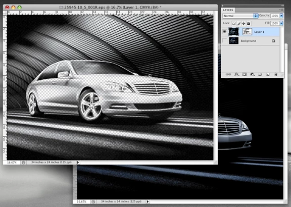 7. Now with this selection active, you want to Edit > Paste Into. You are now pasting into the selection your converted image, but it will be only affecting the darkest parts of your image. The result will also create a new layer and layer mask. If you turn off the view of your bottom layer, you can see what you have actually pasted into your image.