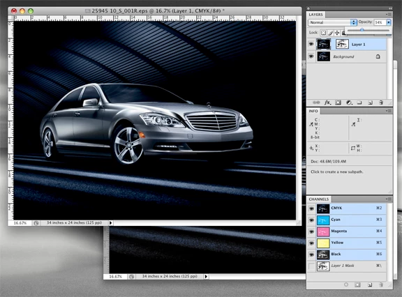 8. Now what I do is use my eyedropper to check the Total Ink with the top layer turned on and then off. I then use the Opacity slider on the top layer to get my image so that the Total Ink meets my desired 300 level. Once it's where I want, I flatten my image and then all is done. Your "copy" image you can just close and no save.