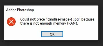 I opened a very small PSD file - 735x200 - 115 kb. After that I tried to place an image as a smart object. The image was only 108 kb. And then BOOM - Could not place "image-name" because there is no enough memory (RAM).