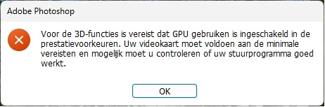 Recently I bought a new computer. It has a NVIDIA GeForce RTX 4060 TI graphics card. I use the most recent driver (NVIDIA Studio driver 551.86). In Microsoft Windows 11 Graphic Settings I have added both 'Photoshop 2024' and 'Photoshop Prefs Manager' as 'High performance'. In Photoshop the GPU compatibility windows shows that this GPU is compatible, however in the info panel it shows that the GPU Modus is "Outdated OpenGL". When I try to use a 3D-effect, I get an error. It says (in Dutch) that the usages of the GPU might be turned off in the performance preferences, that the graphic card might not be compatible with PS or that the drivers could be outdated. How do I get the 3D-functionality in Adobe Photoshop 2024 working?