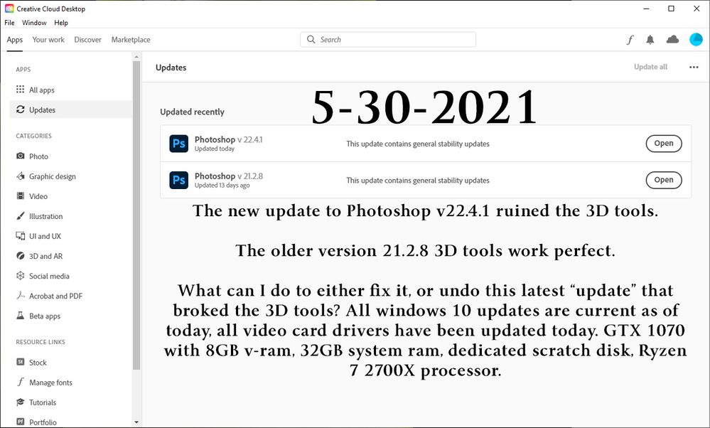 After installing PS 22.4 the 3D features in PS no longer work. If i switch to 3D mode i have a black preview window up to the upper left and the second i try to move the 3D object it vanishes and i get strange artifacts on my screen. If i ignore the fact i no longer can see my 3D object and hit render it will render but not correctly flashing different colors.