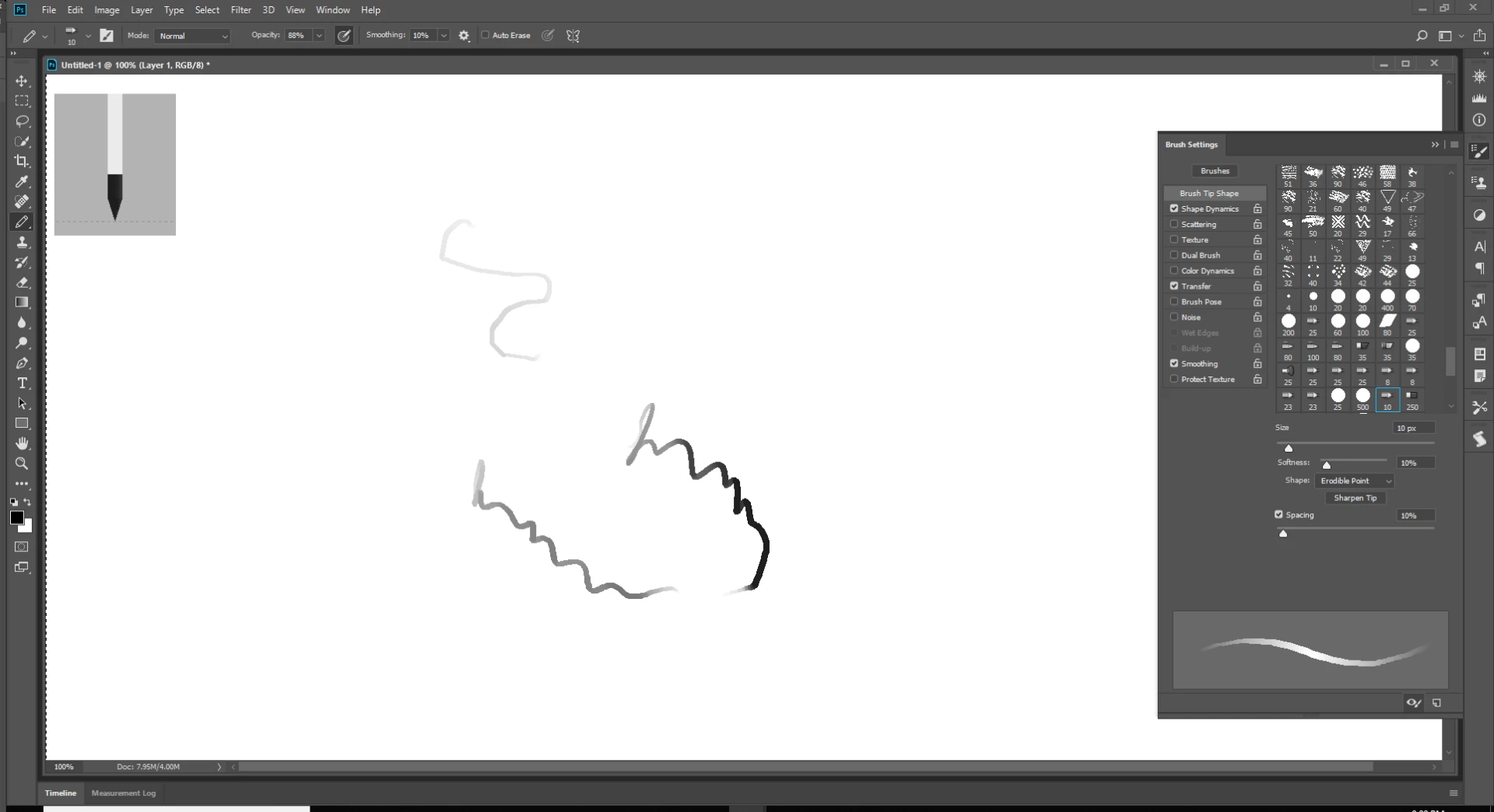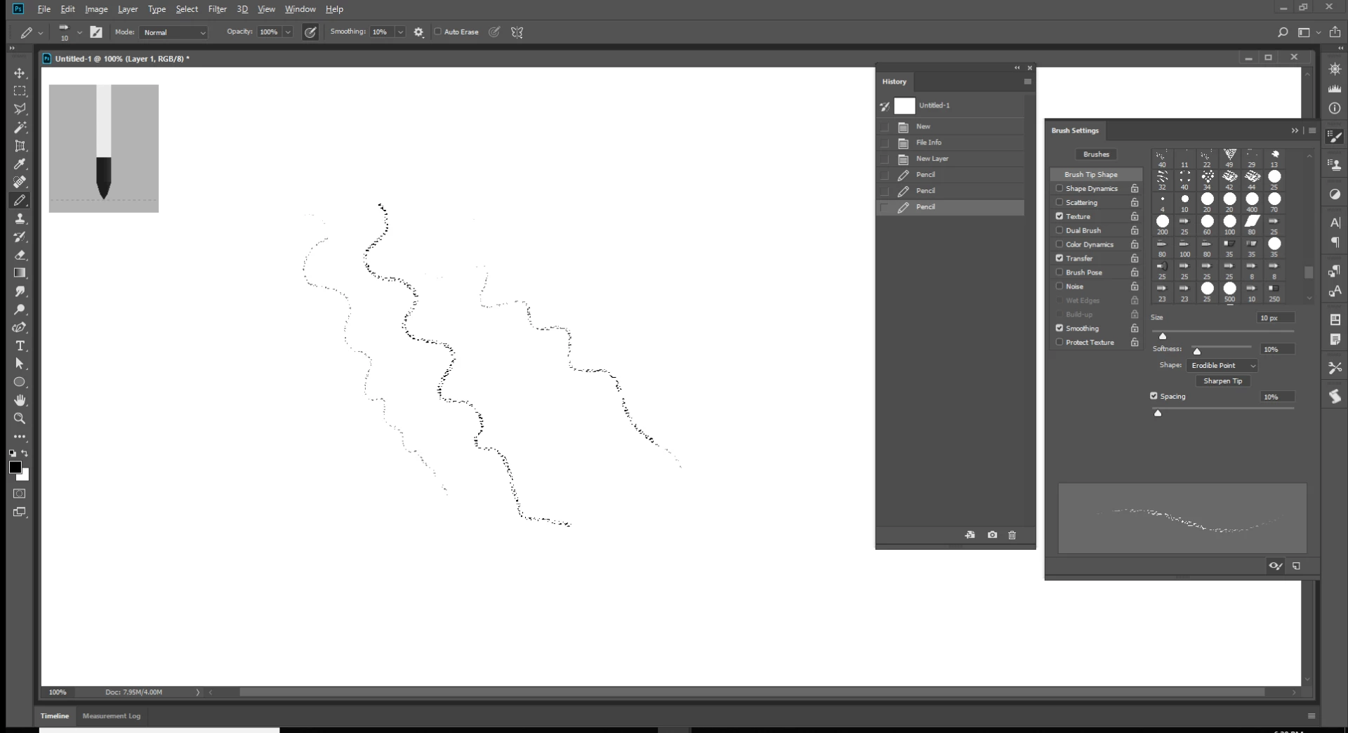 With a document 1890:1417 with a 300DPI resolution with a pencil set to a 10 PX, 10% softness, Erodible Point, Sharpen Tip , 10% spacing. My stroke looks like the preview stroke in the Brush serring palette.