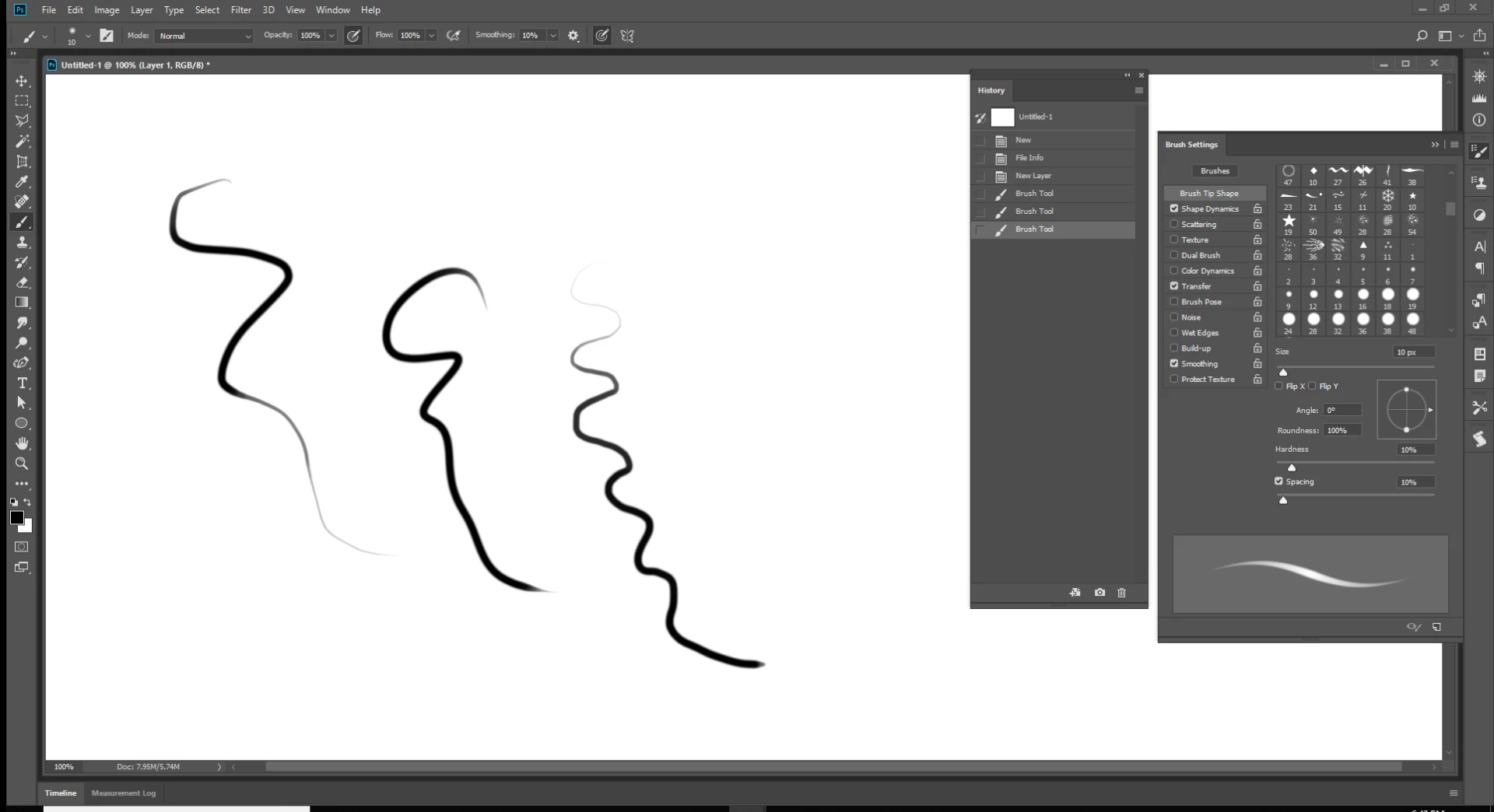 Changing to a 10px Brush with the same setting I see a smoother stroke then you show and you still have not answered what resolution you are editing your document at.