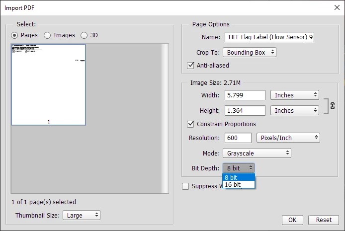 I start by opening a pdf file in Photoshop CC with the following settings but only 8 or 16 Bit Depth is displayed despite selecting Grayscale. Any suggestions would be appreciated.