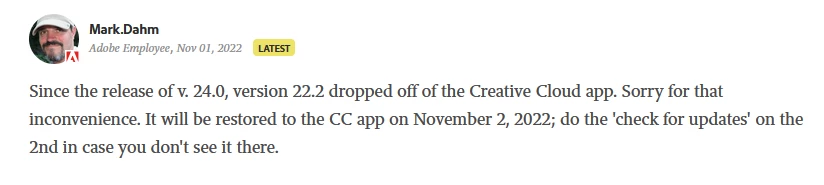 According to this, version 22.2 should be available in the Creative Cloud app today, although that will depend on your location