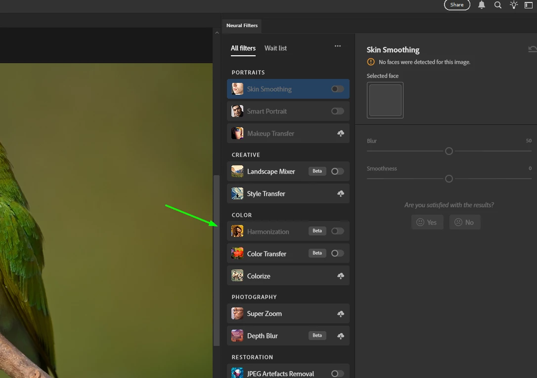 I am currently using the latest version of Adobe Photoshop (v26.9), but I am unable to access some of the newly introduced features. For example, the “Harmonize” option (Color Harmonization) does not appear in the Properties panel when it should.