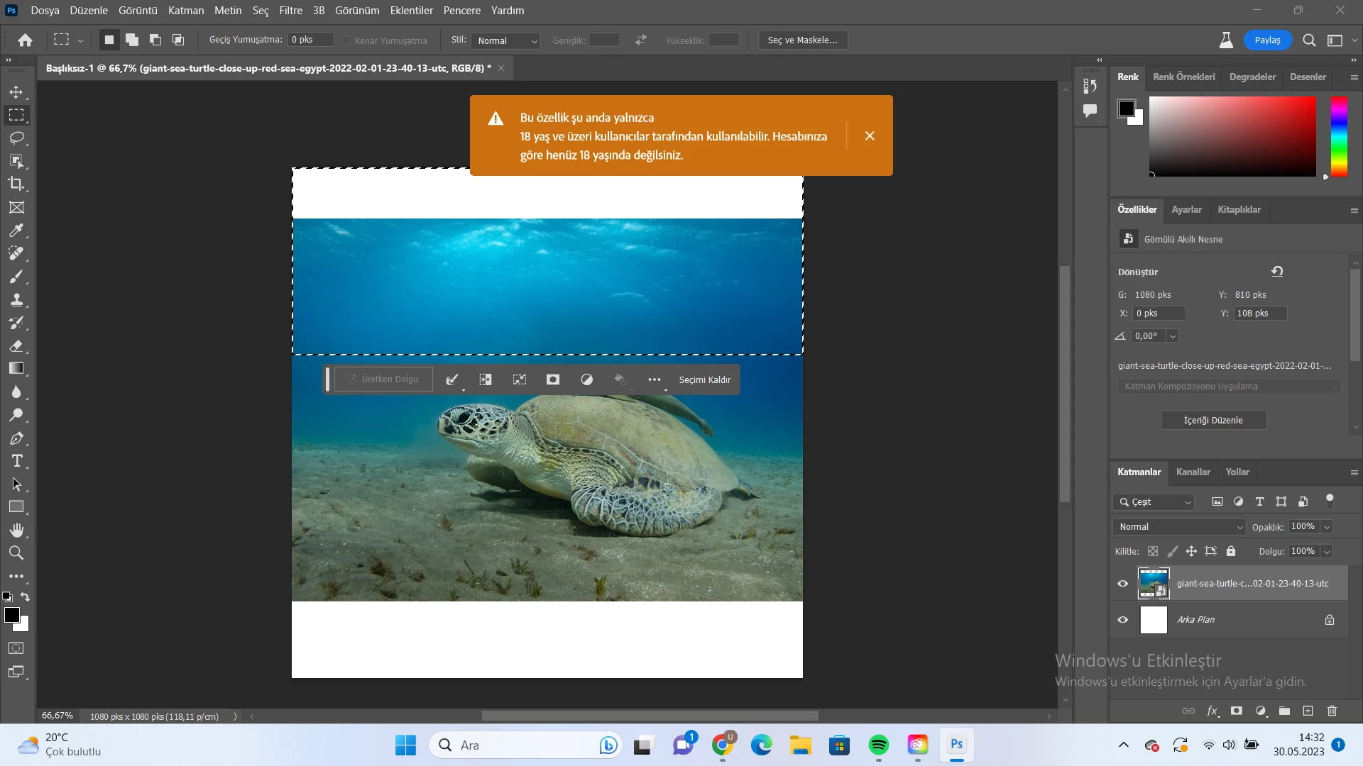 Hello, I wanted to use a feature in the Photoshop beta version, but a warning came up saying I cannot use it because, according to my account, I'm under 18 years old. However, I'm older than 18, so there must be a mistake. How can I change this?