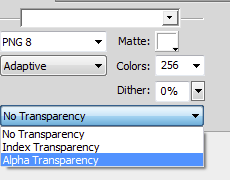 Since I require the alpha channel to remain intact, I am forced to export to a 32bit png (png-24 with transparency checked). Png-8 would be a much better choice, since this image could be optimized with a limited colour palette, but Photoshop does not allow a full alpha channel to be included in that case. In short, a pixel's transparency is either on or off in 8bit png mode.