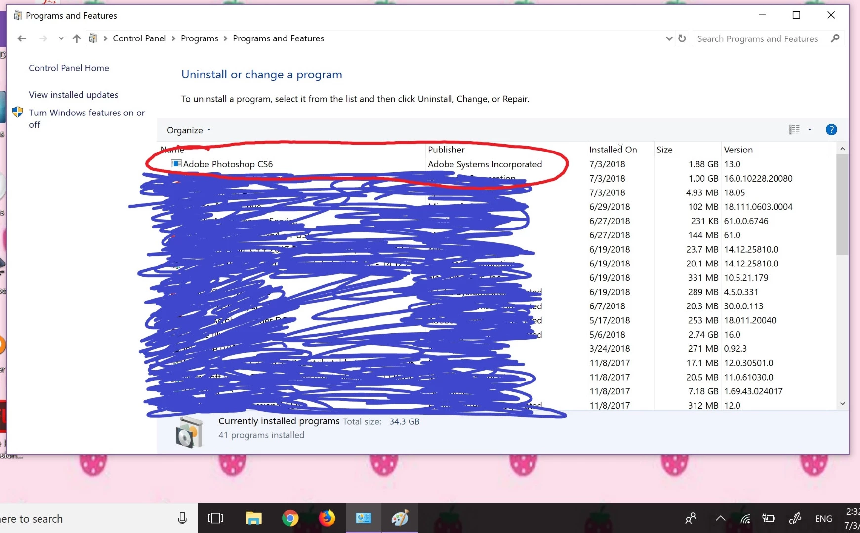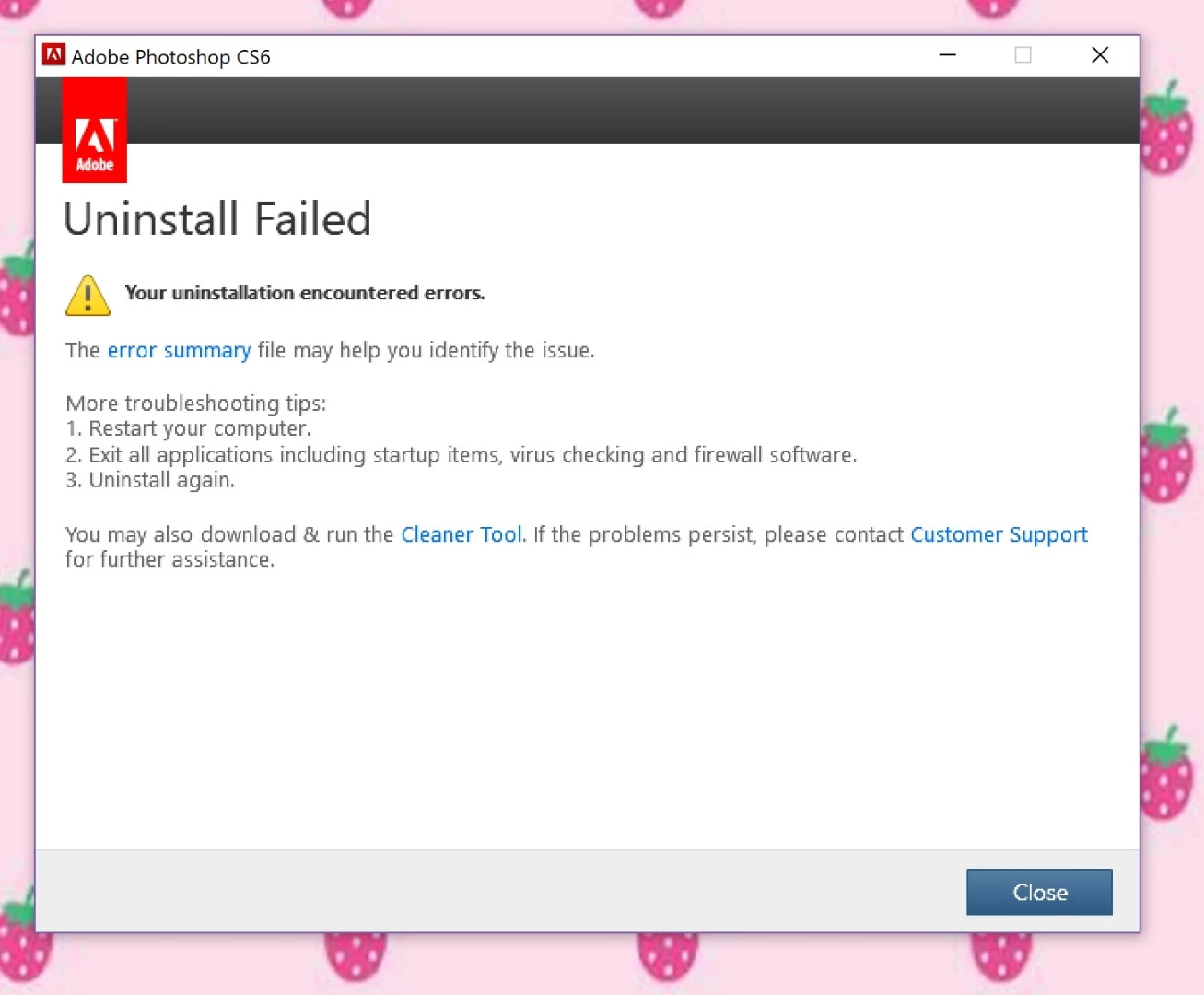 So i tried to search online on what I need to do to fix this and I tried the CC cleaner but Photoshop CS6 wasn't on there to fix. I went to the control panel to see if the program was on there so i can uninstall it off of there then try to reinstall it, and it was on there. But when I clicked uninstall I got an error and I clicked to view details and it says it couldn't uninstall because it wasn't installed, but it was obviously on the installed programs list.