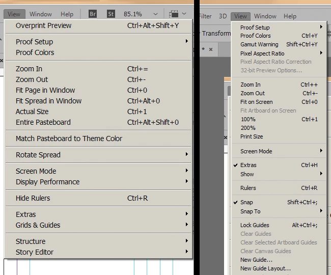 InDesign drop-down options (left) versus Photoshop screenshot (right) below. Photoshop on the right is set to "large" UI font size. Notice how the top menu options are the same size, but the drop-down options in Photoshop are too tiny.