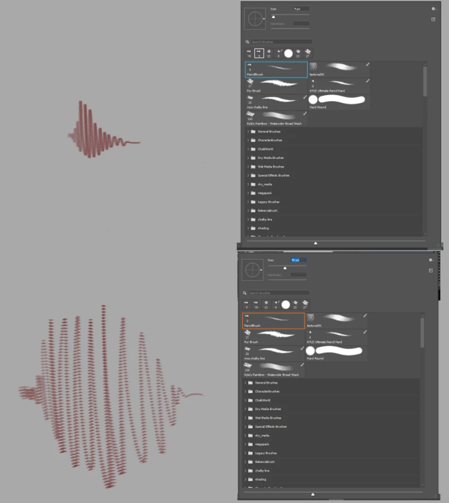 Its the PencilBrush tool - this has been one of my favorite sketching brushes but it has stopped working as it once was. when increasing the size of the brush, it doesnt seem to scale the stroke instead making a scattered line of texture .