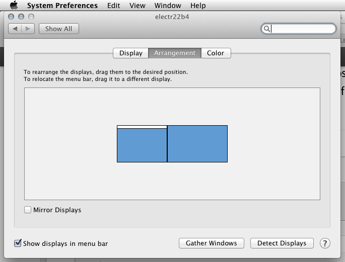 As I said in my previous post, "gener7 earlier suggested a fix that worked for me" There are many users who will prefer different solutions to the same problem depending on their specific needs and preferences. My monitors are aligned with each other at the bottom rather than at the top, as my laptop and external monitor are both resting on the table, and it would be very awkward to try to physically align them at the top. The fix of moving the menu bar was a perfect solution for me. To claim that there's a "true solution" that's right for everyone is just not true. Perhaps you should keep that in mind in the future instead of trying to downplay everyone else's suggestions. This forum is meant to help people, and trying to pretend that you know their needs better than them is quite frankly not helpful. I never implied anywhere in my post that your solution does not work, and I'm sure it is the best solution for some of the people that end up here, but not for all of them.