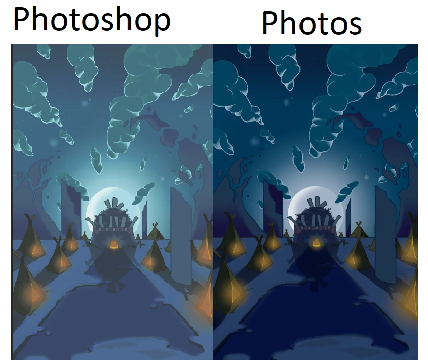 As you can see the colors are a lot different. It sucks because I paint in Photoshop everyday. I didn't notice the color difference until I saved a landscape page I was painting.