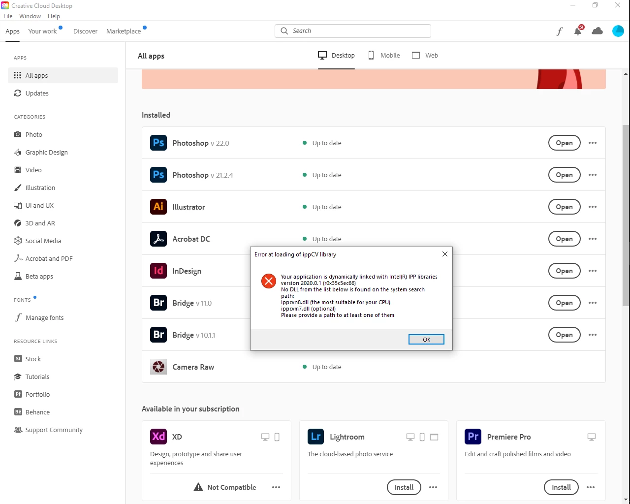 Why do i keep getting this message, photoshop will not open all other creative suite working ?