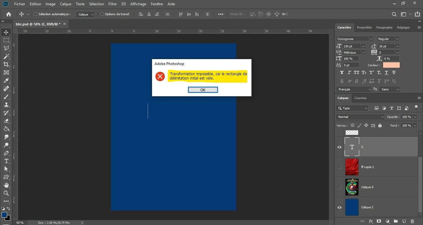 j'ai un problème avec mon outils texte depuis hier. lorsque j'écris le texte ne suis pas en ligne horizontale, les caractères s'alignent sur place et ça forme un petit trait et même quand je veux transformer le texte photoshop affiche le message suivant: transformation impossible, car le rectangle de délimitation initial est vide. Je souhaite vivement que vous m'aidiez à trouver une solution à ce problème très énervant. Merci et bien de choses à vous !