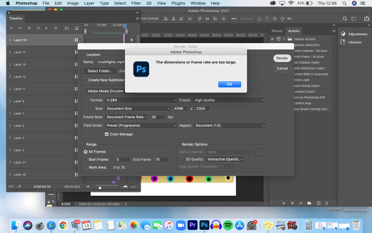 I have tried rendering my animation on photoshop and it comes up with a message saying 'the dimensions or frame rate are too large' ?? it's only a few seconds long so im not sure what's wrong. I don't want to do something that will effect the quality or size of my image either.