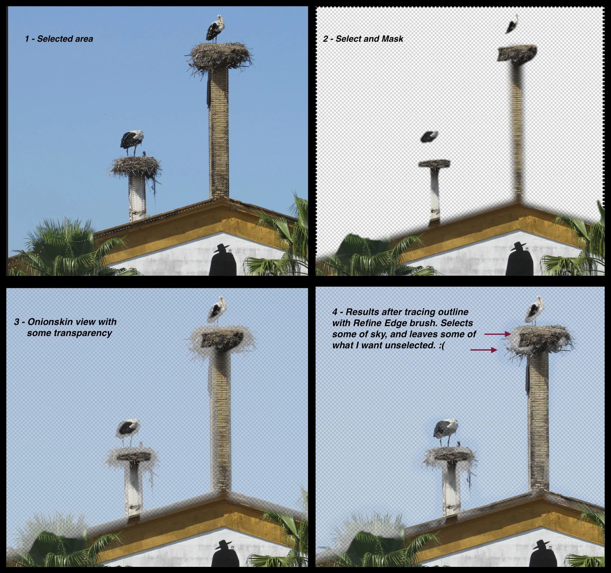 I've tried selecting sky instead of the roof and trees, adjusting Edge Detection and Global Refinement settings, threats, prayer-- none of it works. Hoping someone here can see a missing step I haven't. Thanks!