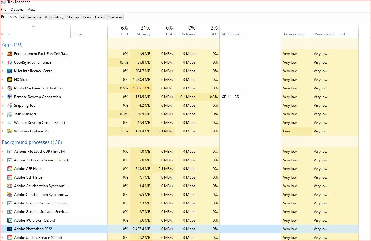 PS doesn't quit completely. After using it and then quitting, it leaves behind a background task that's still running, named "Adobe Photoshop 22" Please see attached screenshot . This prevents me from relaunching PS (apparently). If I use task manager to kill this instance of PS, then I can relauch Photoshop again.