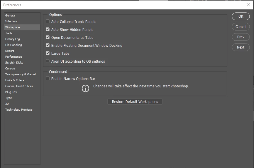1) Menu: Edit -> Preferences -> Workspace -> Restore Default Workspaces