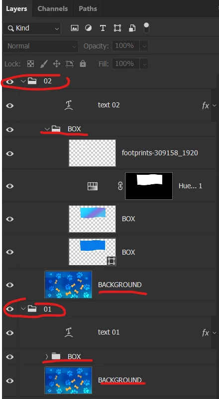 The upper group, "02", is exported correctly, the text layer of the lower group is not, there is something wrong, but I don't know what happens, every group has a background layer inside innormal transfer mode...
