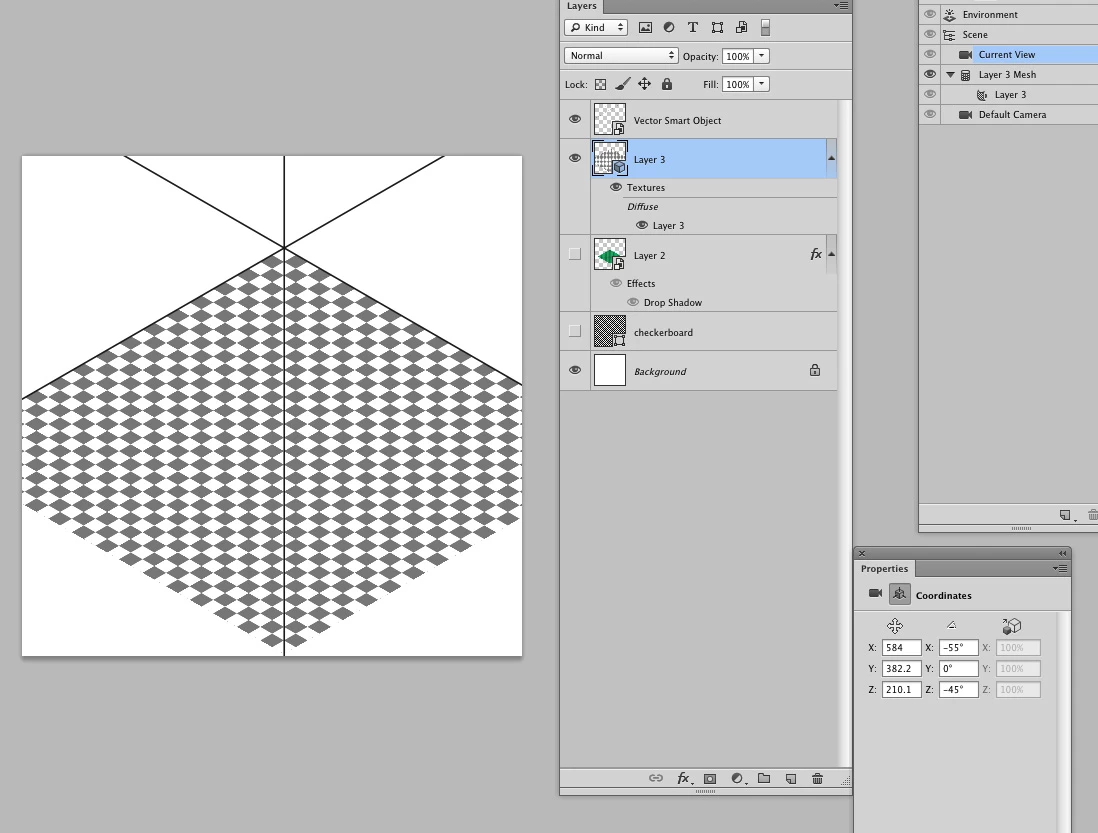 I'm working on a card game where I want to make my straight on designed cards look isometric. Does anyone have the quickest/simplest way to do this with the 3D tool in photoshop? I imagine it's something like Postcard, and then using the orthographic, with some angles set? I've had a try but can't get it right.