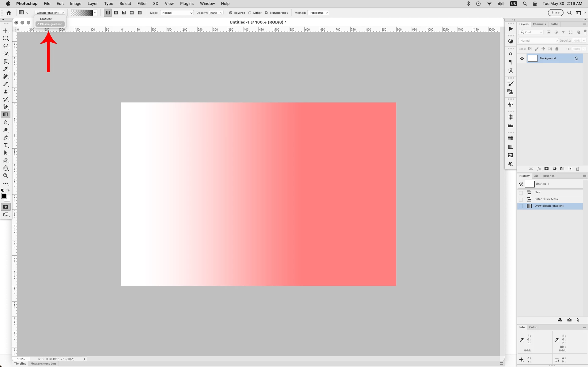 For years I clicked on quickmask at the bottom of the toolbar and then drag the gradient tool through the image and get the red mask indicator, click on the quickmask and get the selection. When I try this with the newest version, I get the gradient, not the red mask indicator over the image. I did a work around by creating a layer mask and dragging the gradient tool over the mask to make my gradient selection. Is there a new way to implement the quickmask or am I stuck with the workaround?