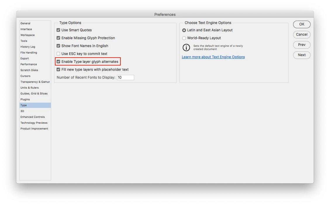 and uncheck Enable Type layer glyph alternates