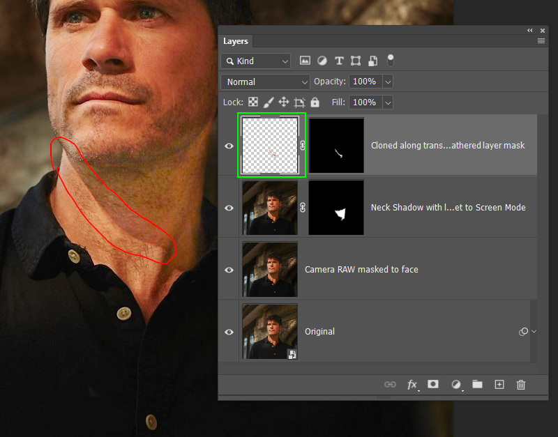 I have been able to remove some of the shadow on the face of the subject in the image below through using RGB, screen blending mode and the brush tool but I am unable to use this to remove the shadow shown around the neck. I have tried using other tools recommended by Adobe and in the community forum such as colour brush tool, dodge and patch but this has not worked.