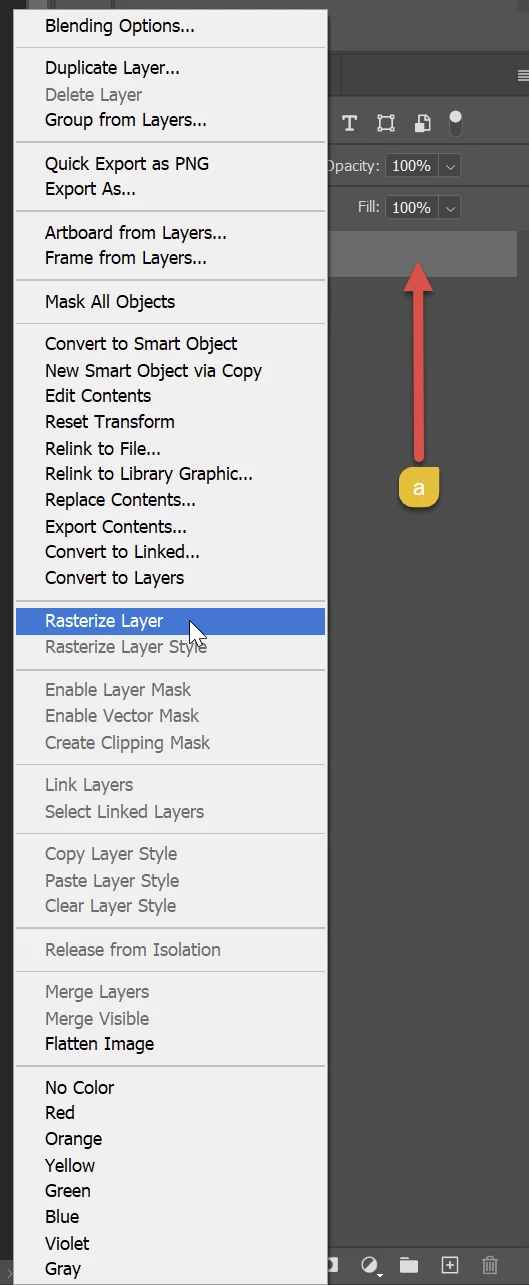 As to why rasterize layer is not showing for you would need to see a screenshot to confirm you have the layer selected and see what is missing. Can you please post a screenshot like this?