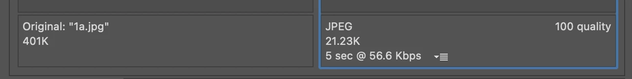 3. Bring the image into save for web. Original image size says 401K. The exported/saved versions image size is 21.23K. Metadata selection is none. Optimized is also selected (screenshot below of sizes).