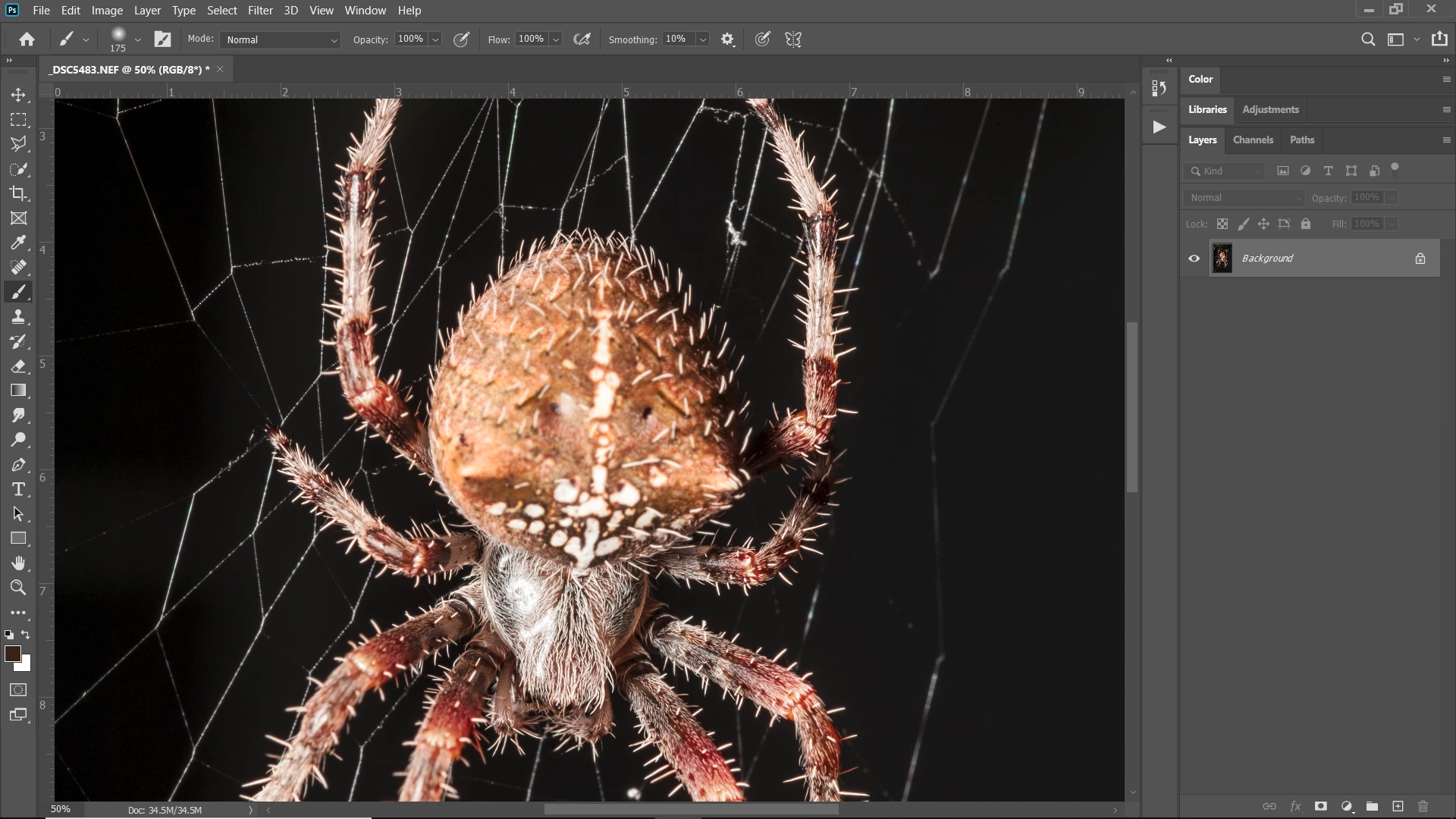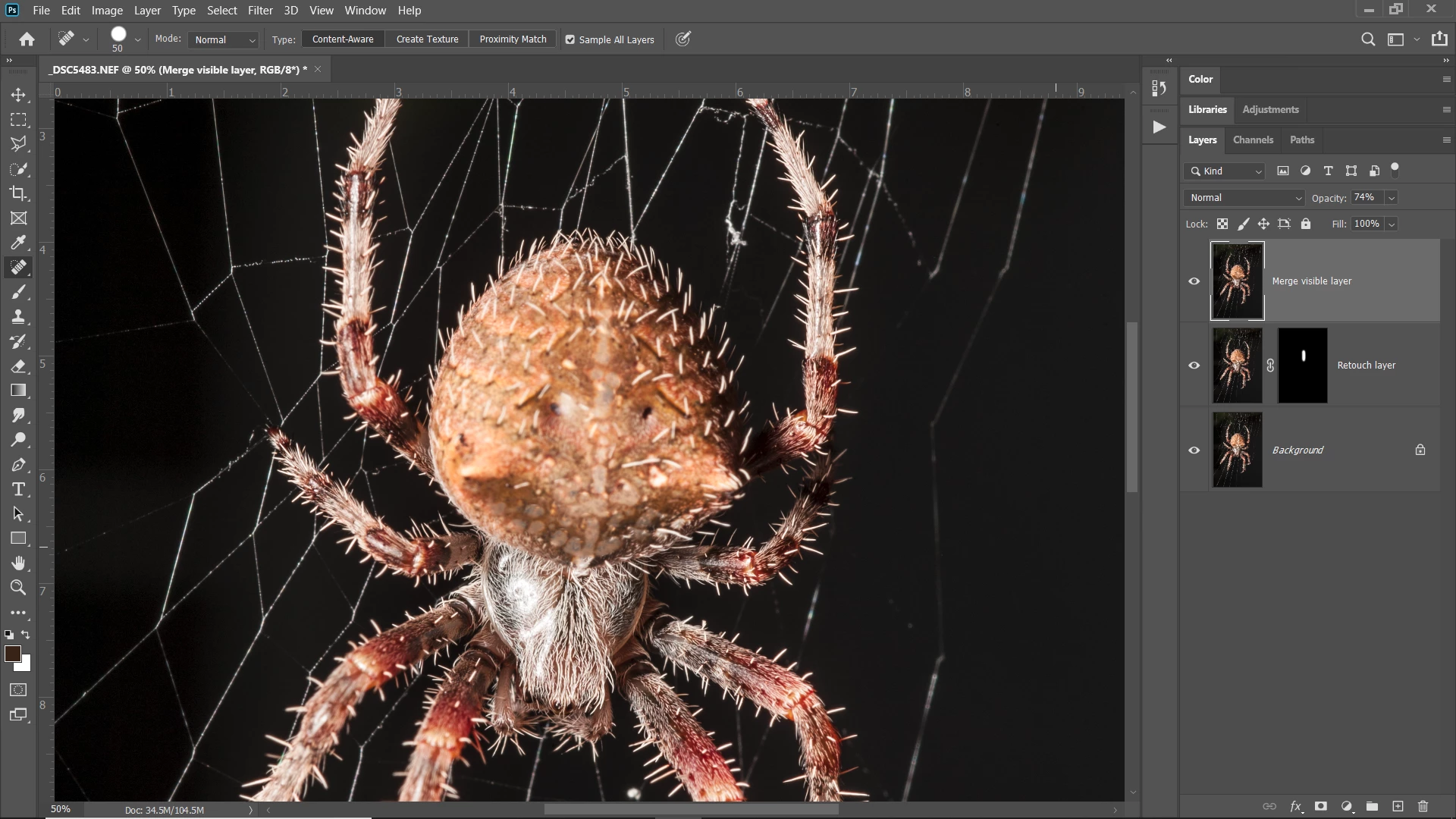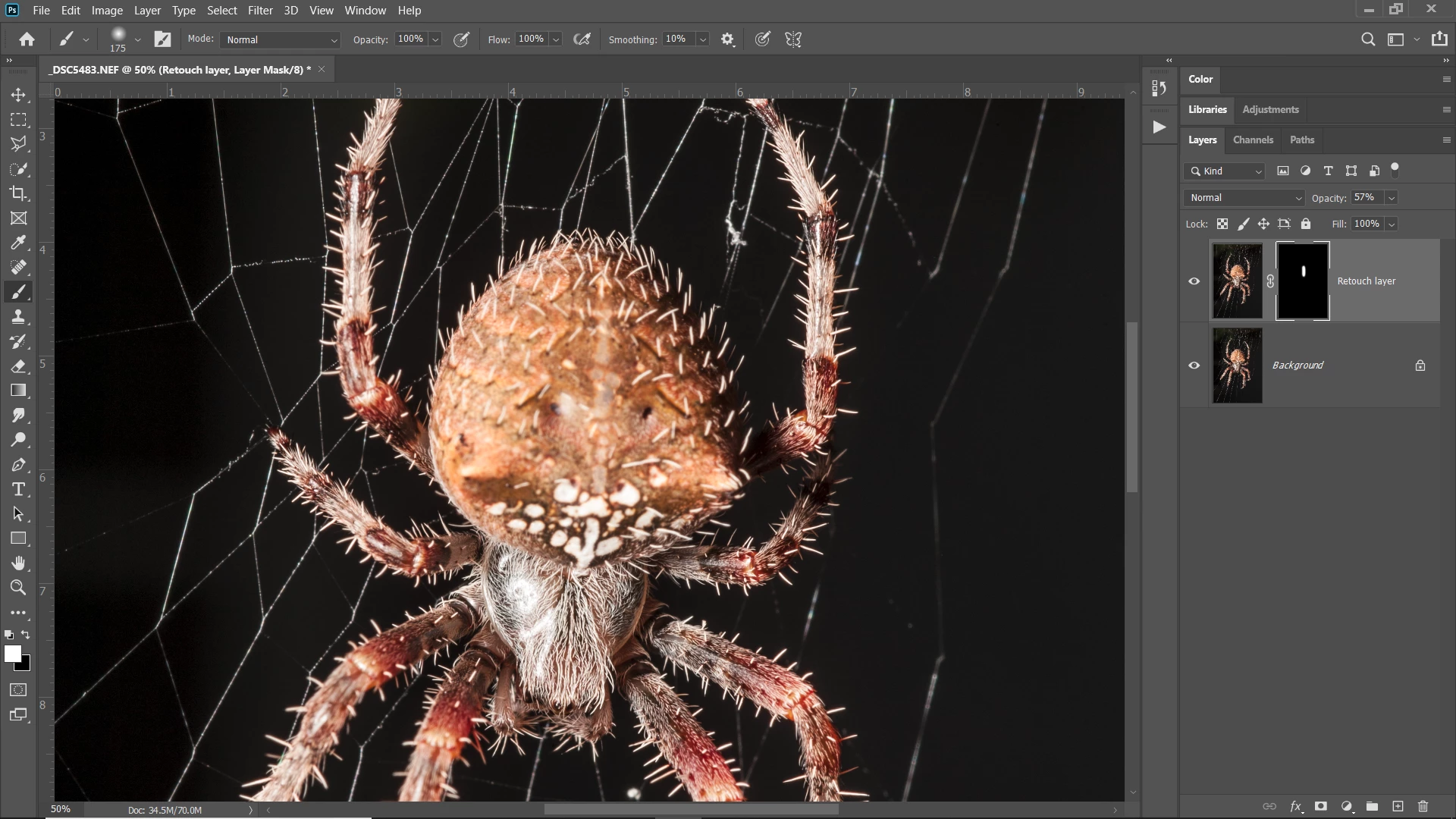 Initially, I want to set the layer opacity of this new layer to 100% and adjust it later. However, setting the opacity of this new duplicate layer to 100% seems to affect the opacity of the previous layer underneath. Only when I set the new duplicate layer (upper most) to 0% that I get the desired effect of the retouch done on the earlier layer underneath; i.e., retouch at a layer opacity of 70%.