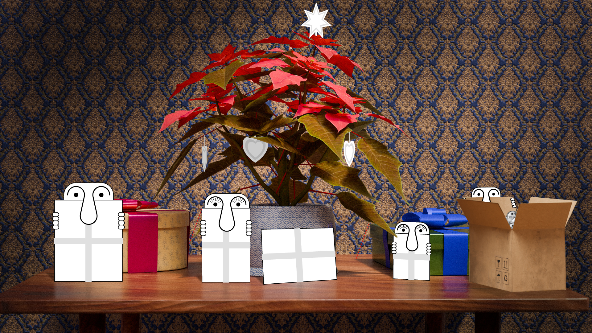 Probably your best ever SFTW upload Jacob. Very graphic, and I love how good the shadows are. I also like the perspective, angles and varying tonal values of the tree ornaments. Lots of nice detail like the fingers on the cardboard box flap, and how the ribons extend slightly beyond the envelopes just as they would if this was real. Did you put it together manually, or is it Ai. If the latter, I am not sure I could dream up a prompt that would produce it. It's a lovely image. Well done.