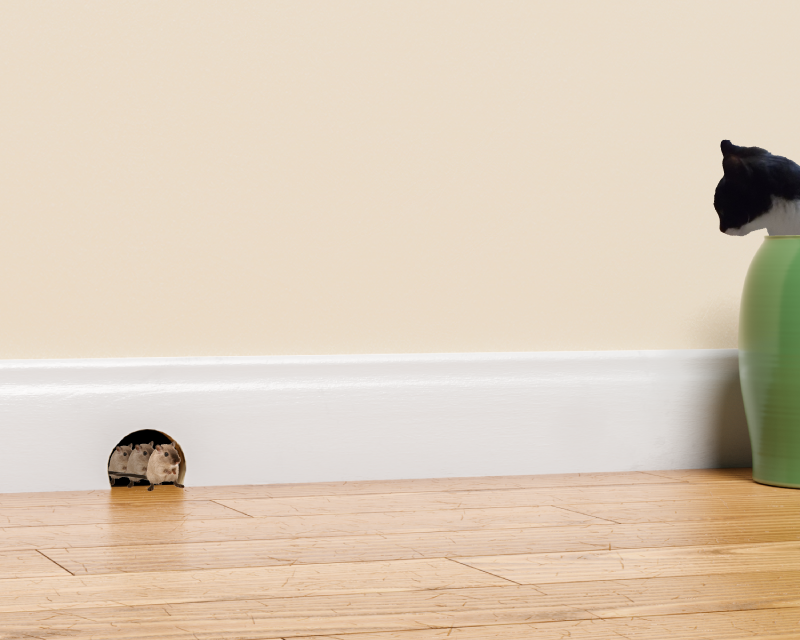 The camera is 0.27m from the floor and the mouse hole is 2.27m along the floor from the camera. The skirting board is 16cm high.