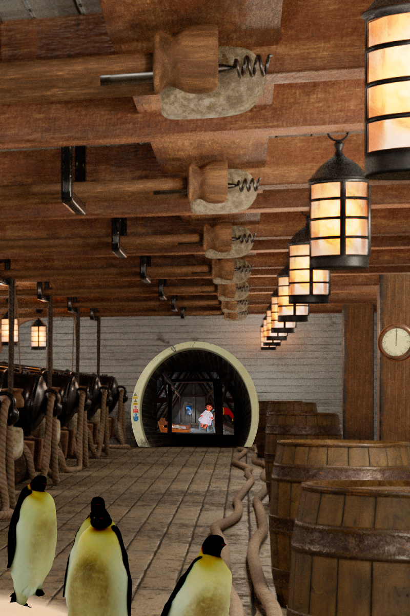 It's supposed to hang parallel to the beams, and so perpendicular to the floorboards - OK, deck or whatever. The question is if you extend the sign down to the...deck...as you can tell I haven't spent much time at sea...will the angle be correct? Not sure. Perspective is more tricky than you'd think.