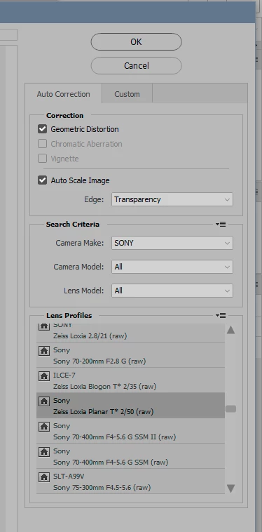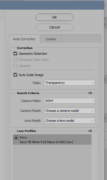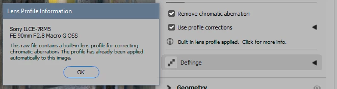 Note that there is an embedded lens profile that will aready have been applied if you shoot raw. But with Sony, that profile just corrects CA, not geometry. For some other cameras, the embedded profile also includes geometry. In any case, it is highly recommended that you apply the lens profile in ACR/Lightroom, on the raw data - not in Photoshop on the rendered RGB file.
